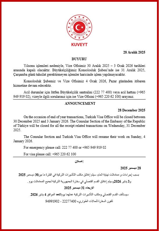 2025 yılsonu işlemleri nedeniyle konsolosluk çalışma saatlerine ilişkin duyuru..