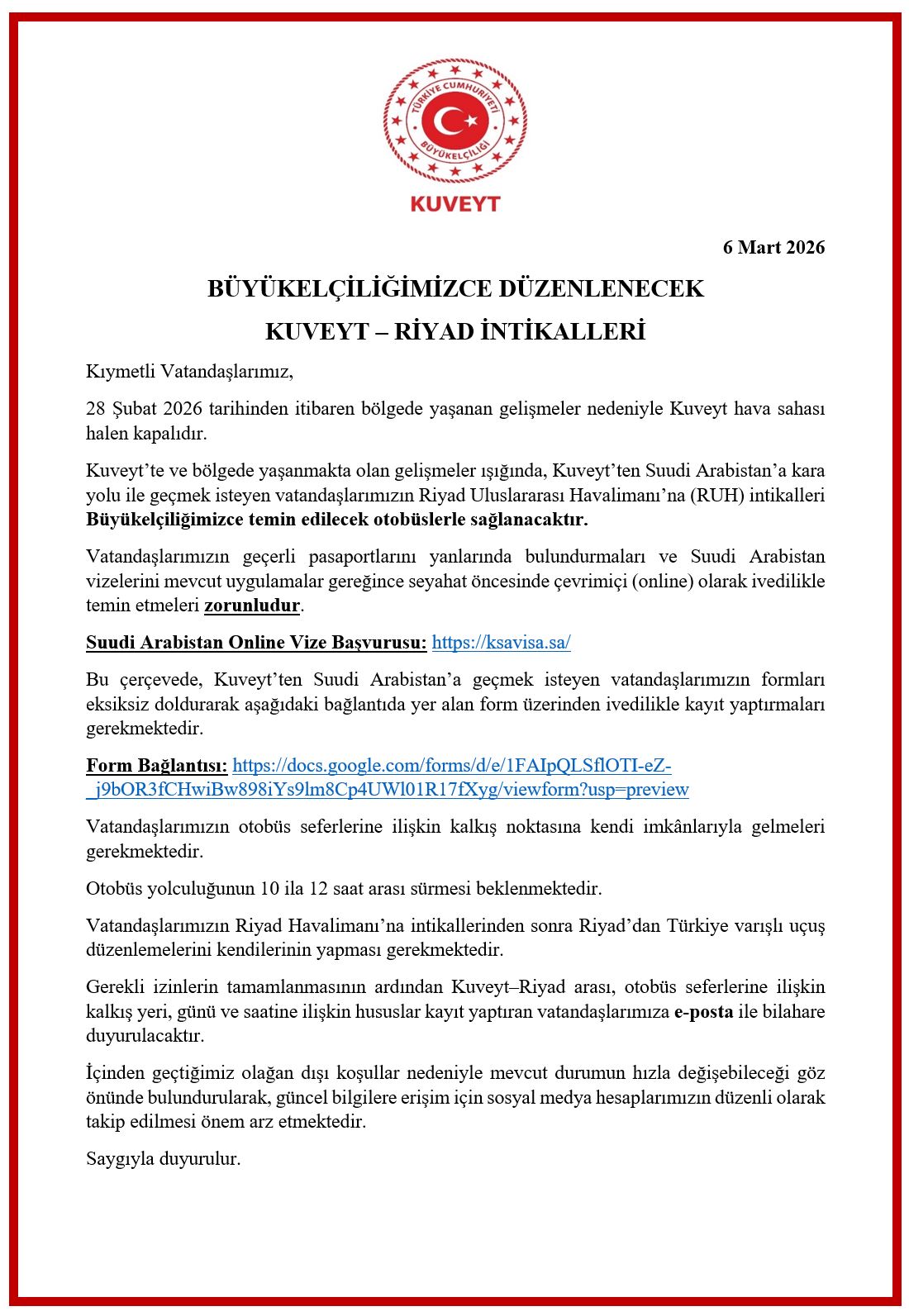 Büyükelçiliğimizce Düzenlenecek Kuveyt-Riyad İntikallerine İlişkin Duyuru